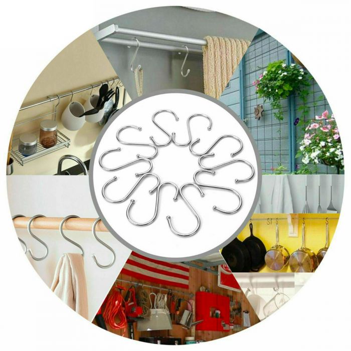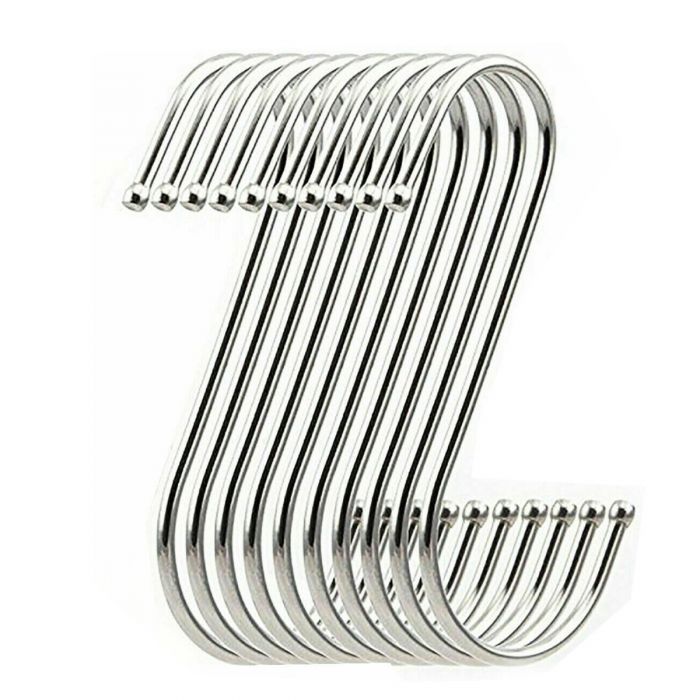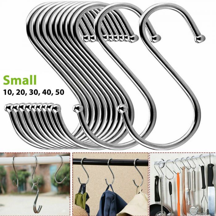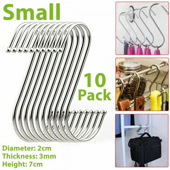 Keep your space neat and organized with this pack of 10 small stainless steel S hooks. Perfect for hanging kitchen utensils, clothes, keys, or tools, these sturdy hooks fit easily onto racks, rods, or shelves. Their rust-resistant design ensures long-term durability, even in humid environments. Compact yet strong, they hold a surprising amount of weight while maintaining their shape. Ideal for home, garage, or office organization, these S hooks offer a simple and reusable storage solution without the need for screws or nails.