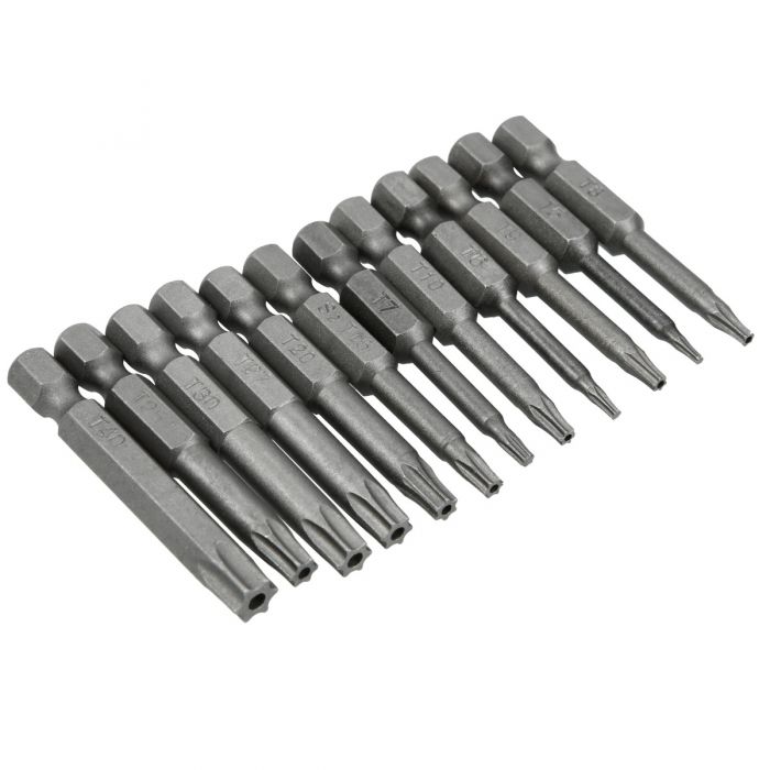 This 10-piece magnetic Torx screwdriver bit set covers sizes T5 through T40, making it essential for electronics repair, automotive work, DIY projects, and precision engineering tasks. Each bit is made from durable steel and designed for a 1/4-inch hex shank, compatible with drills, screwdrivers, and bit drivers.