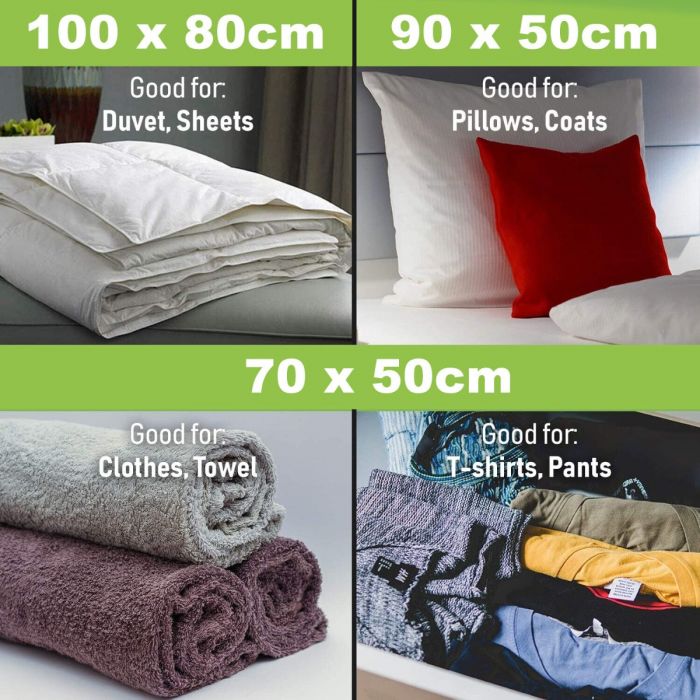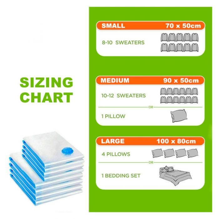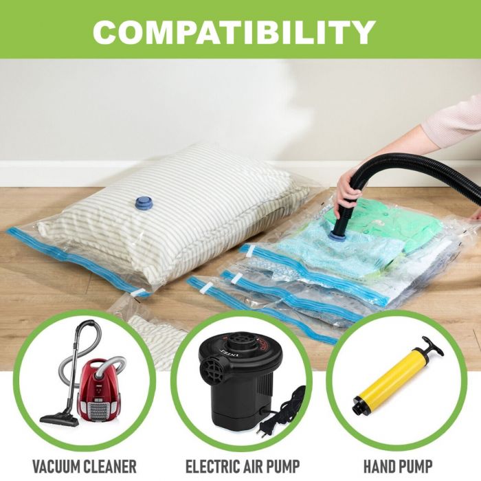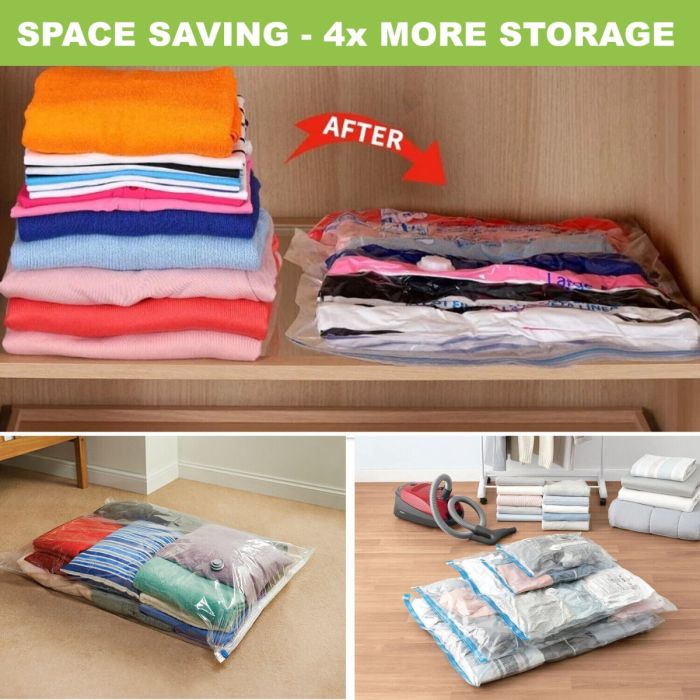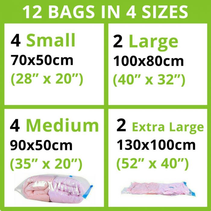 Get maximum storage flexibility with this 12-piece Variety Jumbo Vacuum Storage Bag Set, complete with a hand pump. The pack includes multiple bag sizes to accommodate everything from clothing and towels to bulky bedding and duvets. Designed with a durable airtight seal and double zipper, these bags keep items safe from dust, mold, and moisture while saving up to 80% of space. Perfect for home storage, travel, or moving, helping you stay organized and clutter-free.