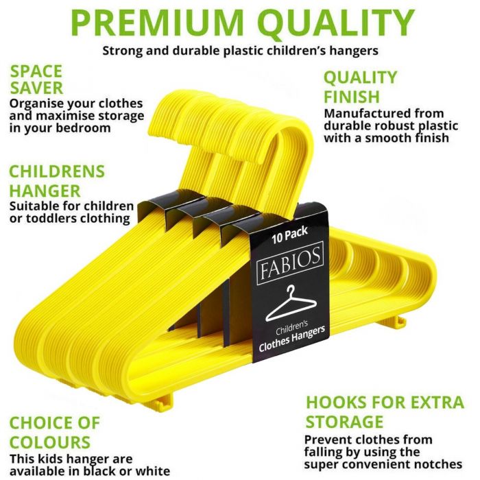 Keep your child’s clothes neatly arranged with this pack of 40 Yellow Plastic Children’s Hangers. Each hanger measures 29cm, making it the perfect size for toddlers’ and young children’s clothing. Designed with shoulder notches, these hangers securely hold dresses, shirts, and strappy garments without slipping. Made from durable, lightweight plastic, they are ideal for everyday use at home, nurseries, or retail stores. The cheerful yellow color adds a bright touch to any wardrobe while helping keep garments tidy and wrinkle-free.