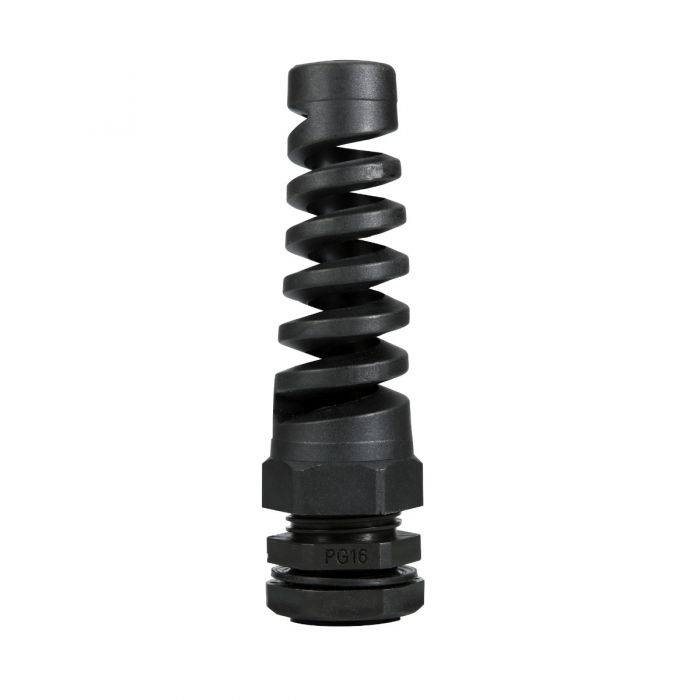 The AVARTEK PG16 IP68 spiral cable gland accommodates larger cables between 10mm and 14mm, providing robust strain relief and sealing for demanding applications. The spiral tail design reduces cable stress and supports natural movement, preventing damage over time.