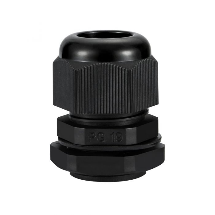 This PG19 IP68 cable gland supports cables between 12mm and 16mm, offering robust sealing for high-capacity electrical installations. The nylon body provides strength and resistance to environmental stress.