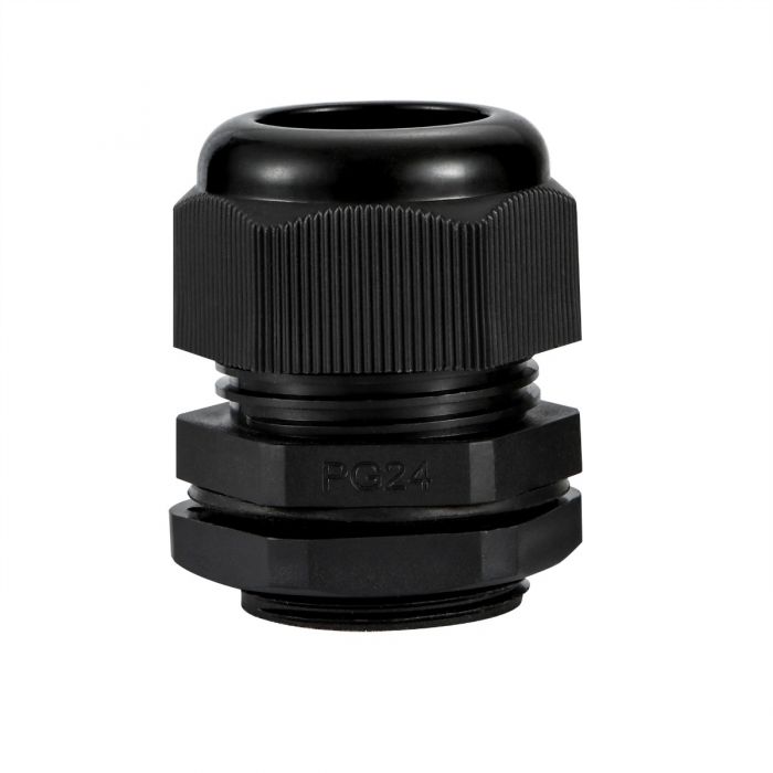 This PG24 cable gland provides strong sealing for 15–20mm cables, offering full IP68 protection from water and dust. The rugged black nylon construction ensures resistance to impact, UV exposure, and industrial chemicals.