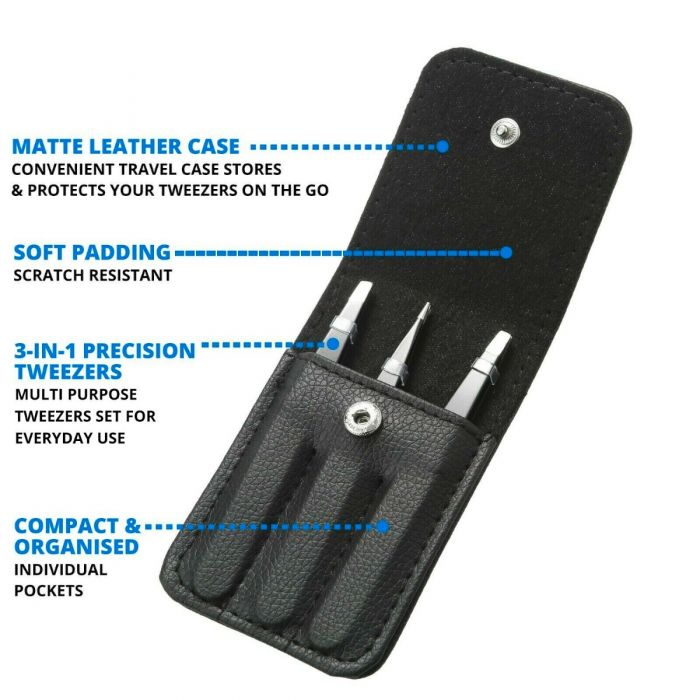 Achieve salon-quality grooming at home with this 3-piece professional tweezers set. Crafted from premium stainless steel, each tweezer features a different tip—slanted, pointed, and flat—for precision plucking and shaping. Ideal for removing unwanted hair, ingrown hairs, or splinters, these tools offer perfect grip and alignment. The set comes in a stylish protective case for easy storage and travel. Durable, rust-resistant, and easy to clean, these tweezers are suitable for both men and women who value accuracy and hygiene in personal care.